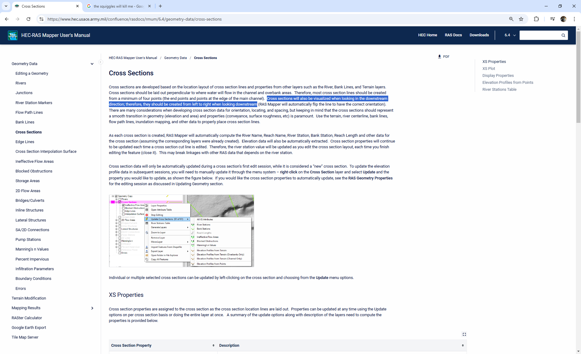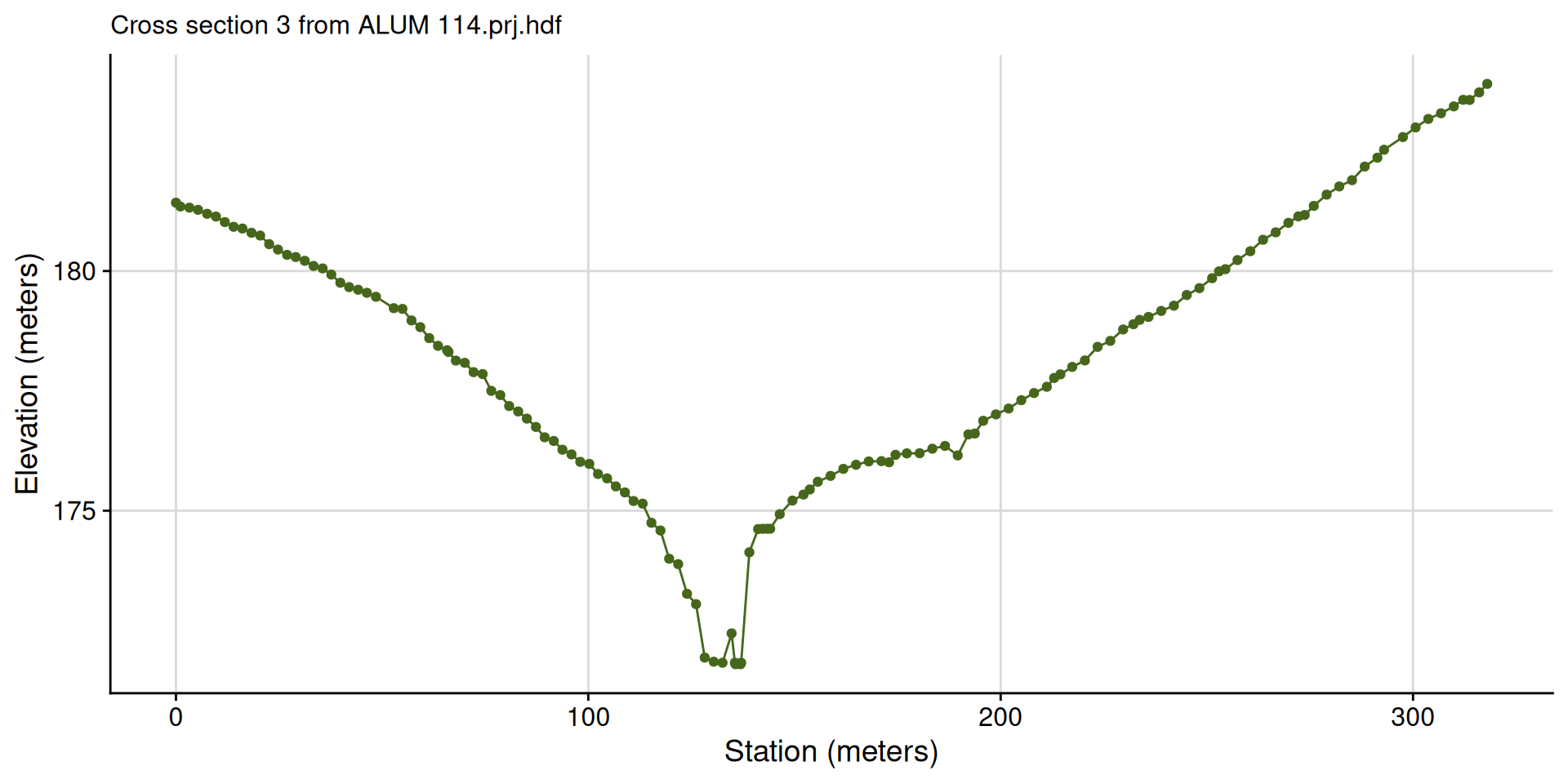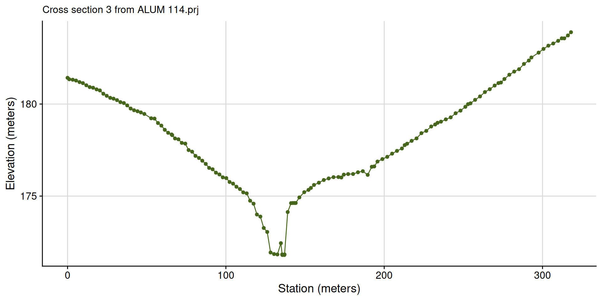Cross sections should be laid out perpendicular to where water will flow in the channel and overbank areas. Therefore, most cross section lines should be created from a minimum of four points (the end points and points at the edge of the main channel). Cross sections will also be visualized when looking in the downstream direction; therefore, they should be created from left to right when looking downstream (RAS Mapper will automatically flip the line to have the correct orientation).